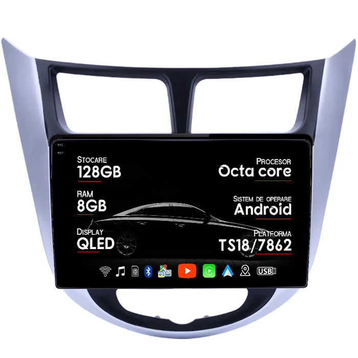Navigatie dedicata Hyundai Accent 2010-2016, 8GB RAM 128GB ROM, Octacore, Platforma 7862, Android 14, Display QLED 9", Suporta camera 360", DSP, Carplay&Android Auto, SIM 4G, Ventilator Activ