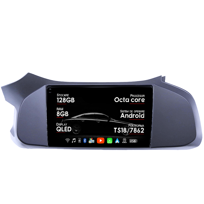 Chevrolet Navigatie dedicata Chevrolet Onix 2012-2019, 8GB RAM 128GB ROM, Octacore, Platforma TS18, Android 14, Display QLED 9", Suporta camera 360", DSP, Carplay&Android Auto, SIM 4G, Ventilator Activ