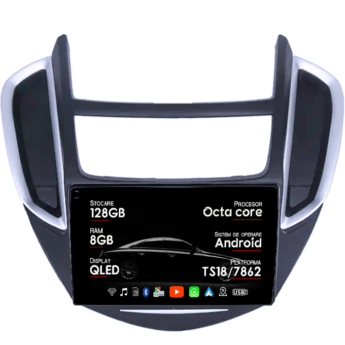 Chevrolet Navigatie dedicata Chevrolet Trax Tracker 2014-2016, 8GB RAM 128GB ROM, Octacore, Platforma TS18, Android 14, Display QLED 9", Suporta camera 360", DSP, Carplay&Android Auto, SIM 4G, Ventilator Act