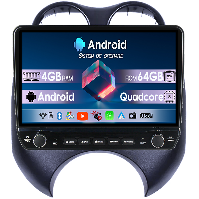 Nissan Navigatie dedicata Nissan March 2010-2013 Tesla cu butoane rotative model 2024, 4GB RAM 64GB ROM, Procesor Quadcore, Android 14, Display QLED 10", DSP, Carplay&Android Auto