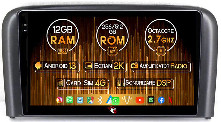 Volvo Navigatie dedicata Volvo S80 1998-2006, 12GB RAM 256GB ROM, Android 13, Rezolutie 2K, Display QLED, 9", DSP, Carplay, Android Auto, Internet, Youtube, Waze, Wi Fi, USB