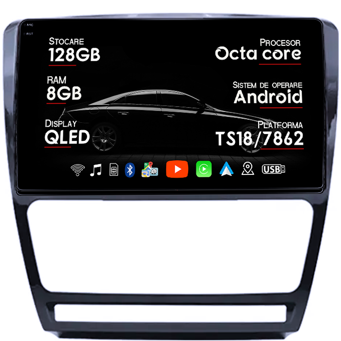 Skoda Navigatie dedicata Skoda Octavia 2008-2013, 8GB RAM 128GB ROM, Octacore, Platforma TS18, Android 14, Display QLED 10", Suporta camera 360", DSP, Carplay&Android Auto, SIM 4G, Ventilator Activ