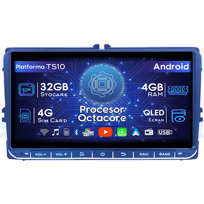 Navigatie dedicata Volkswagen, 4GB RAM 32GB ROM, Octacore, Android , Display QLED 9", DSP, Carplay&Android Auto, SIM 4G, Bluetooth, Ventilator Activ - Resigilat