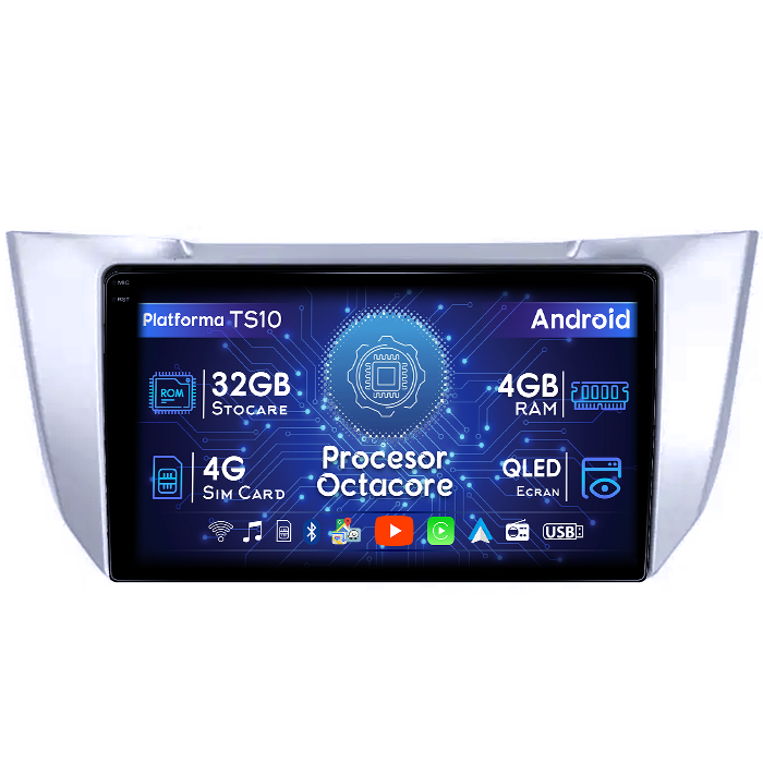 Navigatie dedicata Lexus RX300 RX330 RX350 RX400H 2003-2009, 4GB RAM 32GB ROM, Octacore, Android 14, Display QLED 1K 10", DSP, Carplay&Android Auto, SIM 4G, Bluetooth, Ventilator Activ