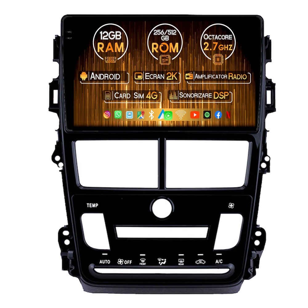Toyota Navigatie dedicata Toyota Yaris 2017-2019 CL, 12GB RAM 256GB ROM, Android 14, Rezolutie 2K, Display QLED, 9", DSP, Carplay, Android Auto, Internet, Youtube, Waze, Wi Fi, USB